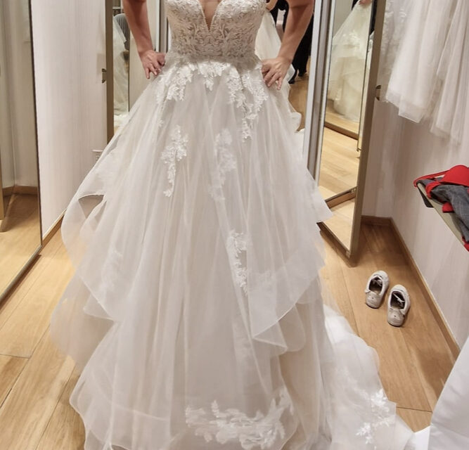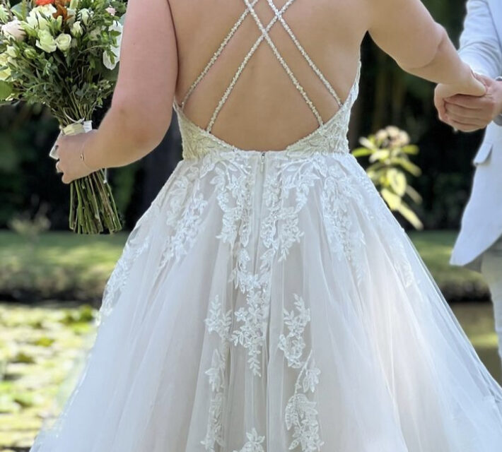 Vestido de novia evasé con escote de pico y espalda descubierta con tirantes de pedrería